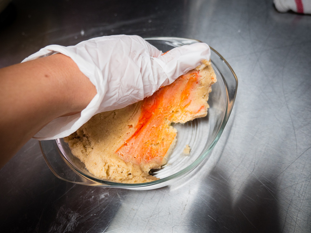 Optional: dye half the dough with 3 squirts of orange gel food coloring. Mix the dye thoroughly using gloves.