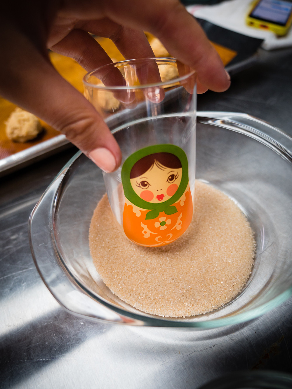 With a small ice cream scoop or spoon drop dough 2 inches apart onto prepared baking sheets. Moisten the bottom of a glass with water and dip the glass in sugar. Gently flatten each drop of cookie dough with the bottom of the sugared glass.